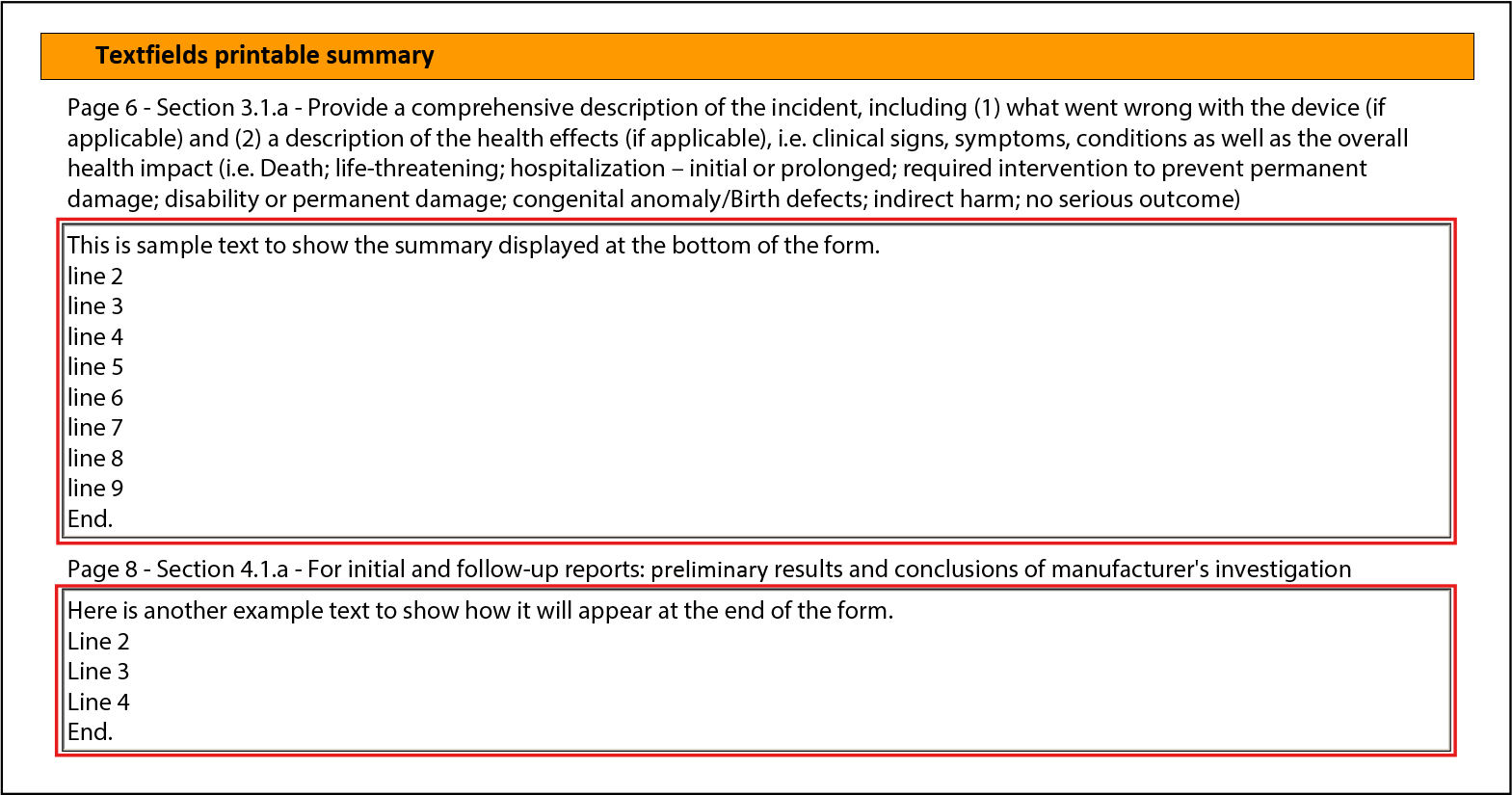 The form will now automatically take the information you type into free form text fields, and duplicate them at the end of the MIR form.